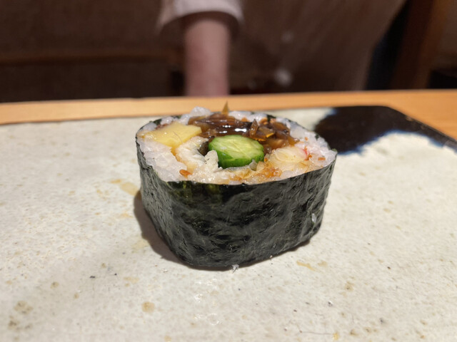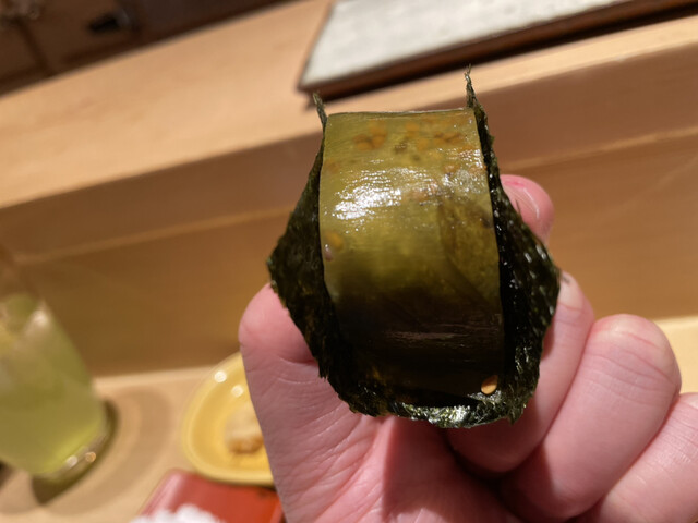 言われて気づいたが、さいとうさんの握りは、1巻握りあたり3回しか握らない(力を入れない)握り方でここもかなり特徴的。通常の寿司屋は大体6-7回力を入れて1巻を握るらしいが、お弟子さん曰く、この技を身につけるのも相当難しいらしい。