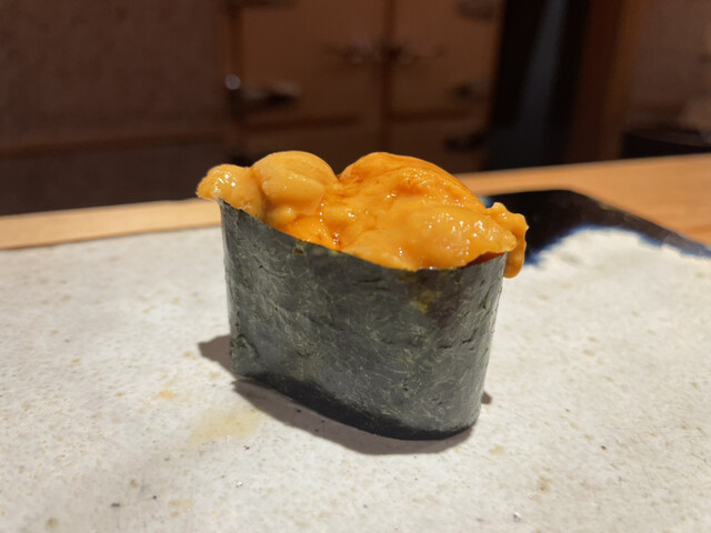 お弟子さんの鮨しゅんじと隣接してる。店内は直線のカウンター8席のみ。L字型やコの字型のカウンターではなく、このスタイルはなんか新鮮。何とも言えない凛とした雰囲気でテンションが上がる。