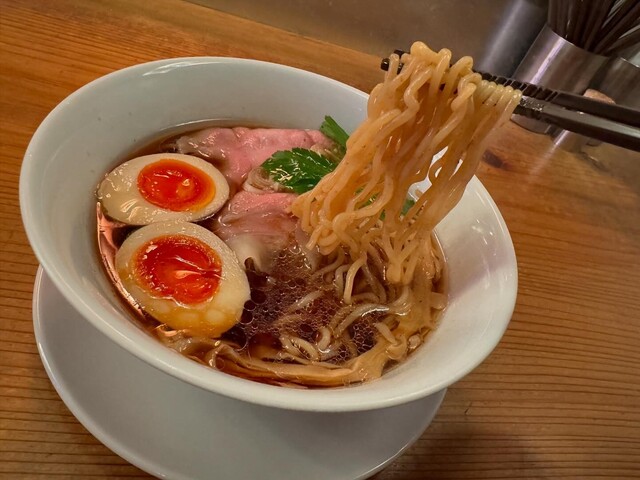 美しく澄んだスープに綺麗に盛られた麺、メンマ、チャーシューに味玉。 表面は少しオイリーでより美しや✨