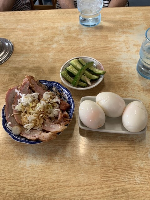それでは、冷やし中華(900円)、餃子(350円)、おつまみチャーシュー(500円)、那須御養卵塩ゆでたまご(100円)、スーパードライ大瓶(700円)をお願いします。