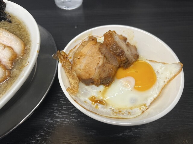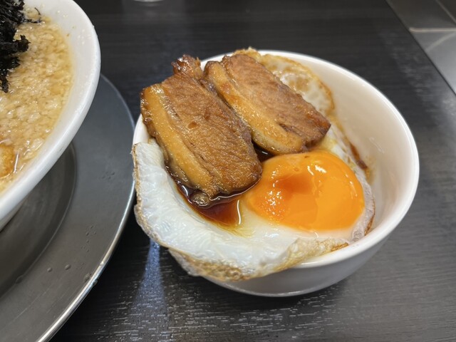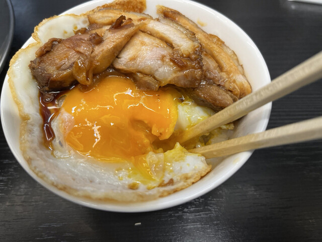 半熟目玉焼きに甘辛いタレをかけたチャーシュー