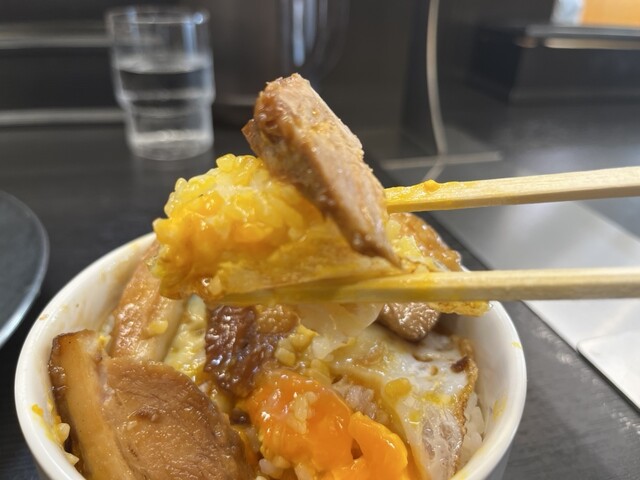 小盛りサイズのご飯に半熟目玉焼きの上に甘辛ダレのチャーシュー。これが絶品!