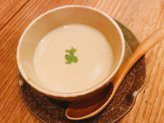 ・里芋のポタージュ。優しい味。何杯でも飲めちゃう。出来ればお代わり自由にして、という贅沢な想いがチラつく。