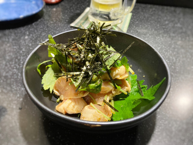 先ずは新メニューの鯨ベーコンポン酢、ささみユッケ、とりわさ、梅水晶を。