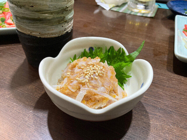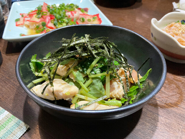 鯨ベーコンポン酢は鯨の脂がとても甘く、ポン酢でさっぱり!ささみユッケ、とりわけも新鮮さが分かる美味しさです。