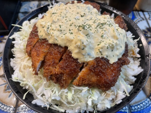 細かく刻んだキャベツの上に、前述の肉厚ジューシーなとんかつと、たっぷりのタルタルソースがかかっている。