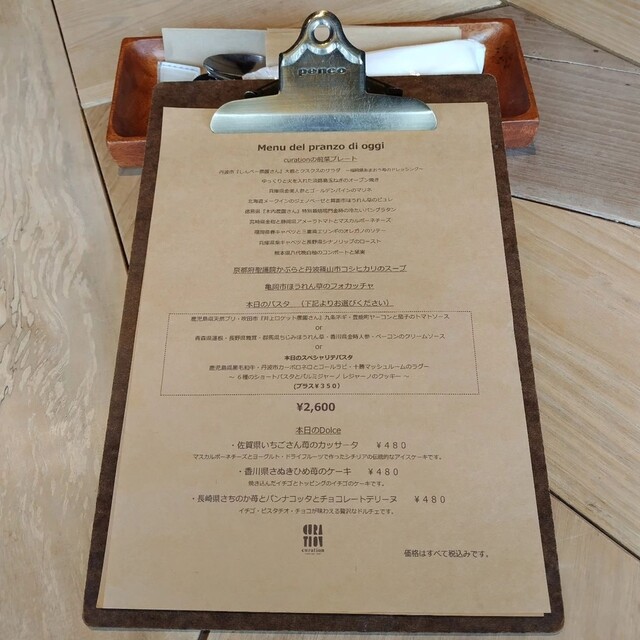 メニューは、2600円のランチのみで、前菜、フォカッチャ、スープ、パスタのセット。パスタは三種類から選べます。デザートは別料金で三種類。お値段は一つ480円でした。