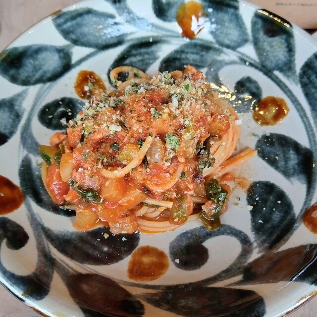 パスタはトマトソースを選択。これがすごく美味しかった。魚介と野菜の旨味たっぷりでコクもありめちゃめちゃこのみの味。