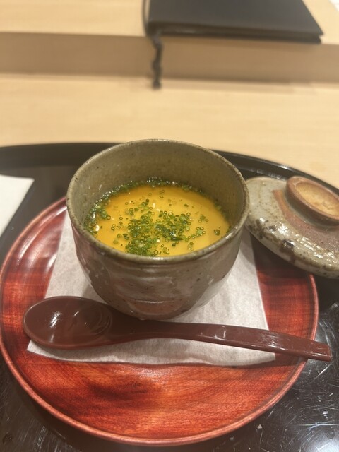 茶碗蒸しの上に餡ではなく、ぽん酢醤油が小口の芽ねぎとともにかかっている。