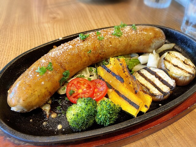 まずはマルゲリータ、生地がとにかく美味い!みみの部分の気泡の入りと食感が絶妙!そして、メインのひらやまピザが来るまでの間に20センチの粗挽きソーセージ鉄板焼き!添加物無しのジューシーで濃厚な味わい♪最後にメインのひらやまピザ!生ハムとサラダ、ピザのコンビネーションがもうたまりません!