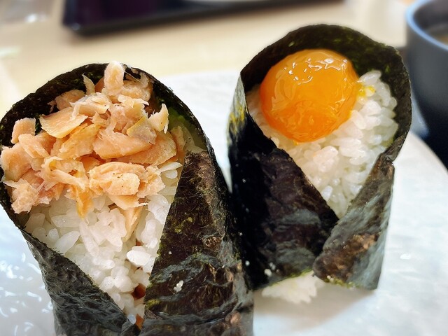 妻は「明太クリームチーズ」と「ツナマヨ」を、私は「北海道秋鮭」と「卵黄醤油漬け」を注文。それに二人とも「けんちん汁」を頼みました。(汁物は日替わり)