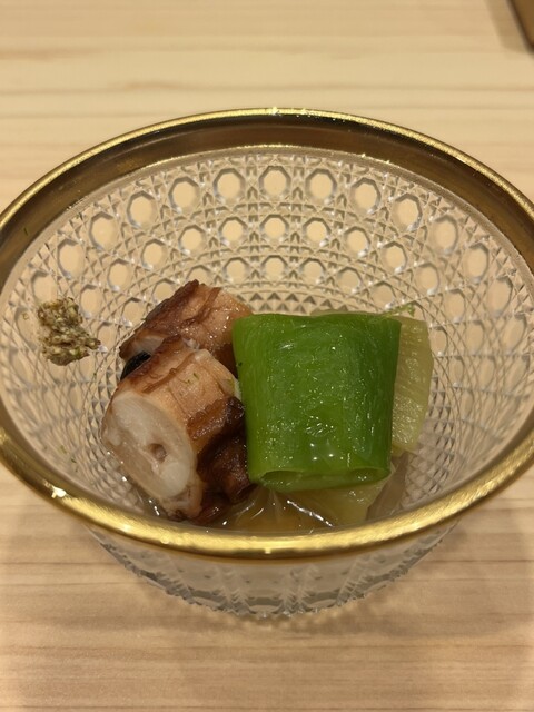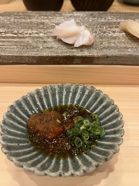 濃厚な肝のソースと柔らかな蒸し鮑。シャリと合わせて食べることで少しさっぱりいただけます。おいしかった、、!