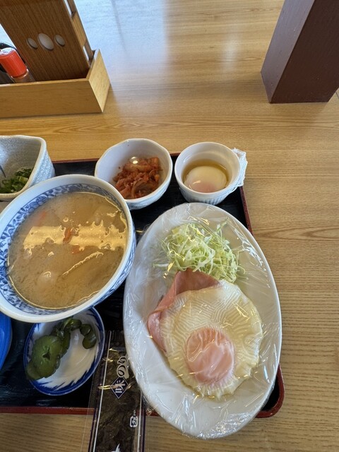 ハムエッグ、キムチ、温泉卵、無料の海苔、青ガッパ漬け