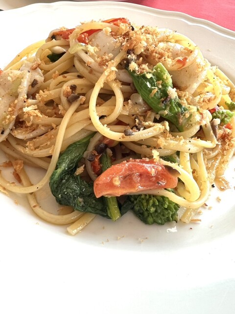 赤イカの下足や、エンペラ、口周りの部分の食感が楽しく、ポロネギとフレッシュトマトの甘い酸味が優しい。