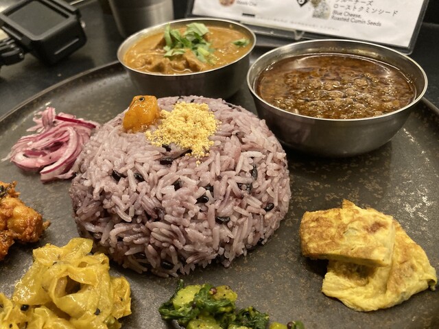 色鮮やか!真ん中の五穀米をチキンカレー、キーマカレー(マトン?)いろんな野菜が囲んでいました。