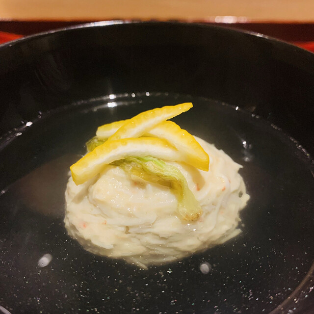 ズワイの身と味噌、フキノトウの真薯、柚子の風味