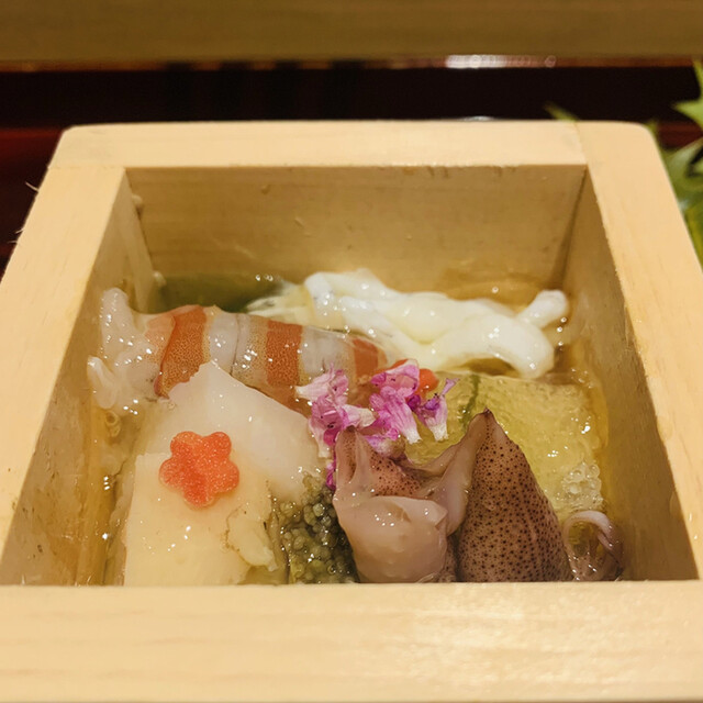 ★ 枡に詰め込まれた玉手箱のような御料理。食材の食感もヨク(特に車海老と鮑)、生姜酢ジュレで纏まった味付け。