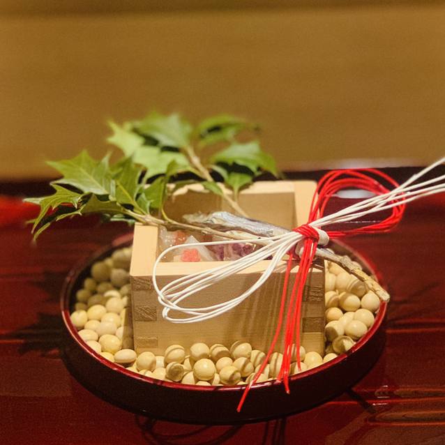 飾りは、鬼避けの「節分鰯」「柊木(ひいらぎ)」