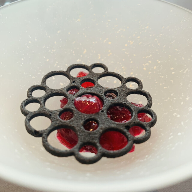 ⑦ スギ版ブラックサンダー:フォアグラ、山栗、アマゾンカカオのソース、ブラックココアのクッキーのせ