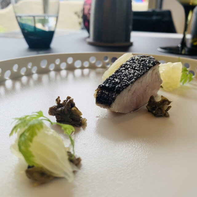 ⑫ 鰆の炭火焼き、バニラ+ライムのソース、シェフが採った夏+秋茸の漬物+高知産グレープフルーツ+ハコベ添え