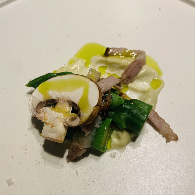 7. 煮真蛸、白アスパラのソテー、ウルイ、2種のソース(温泉卵+オリーブオイル、山菜)