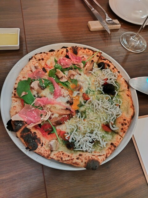 ピザハーフ&ハーフ(名物カンティーニピザ、しらすたっぷり)