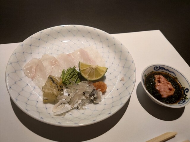 天然とらふぐのフグ刺し、カワハギの肝ポン酢で。