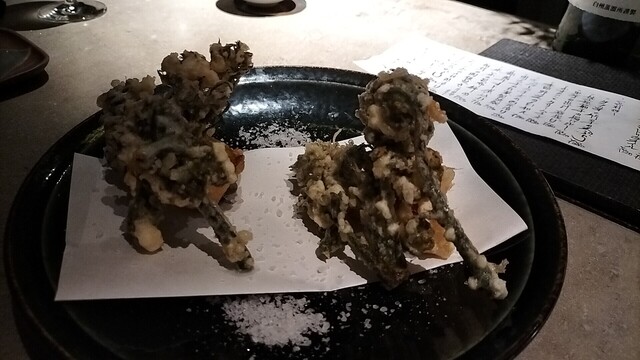 つまみにタイの出汁、里芋唐揚げ、天ぷら、チーズの味噌漬をオーダーし、どれも素晴らしいですね◎