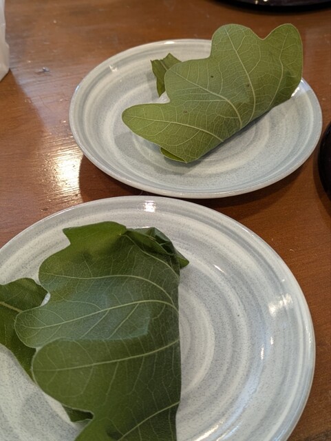 柏餅 この状態ではどちらがこし餡で、粒餡か店員さんでもわからないのだそうです パッケージにはシールでこし餡が表示されてます