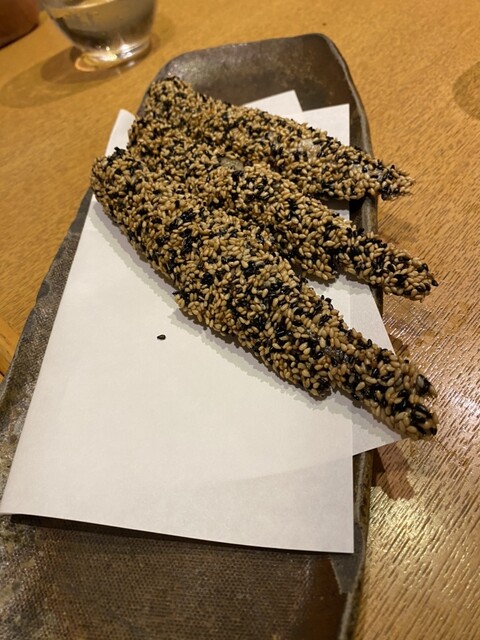 また、蓮根の炭火焼きも食感も良くからし?入りのソースとの相性も抜群、今回初めていただいた本シシャモの胡麻揚げも外は胡麻のカリカリ感、中はホクホクでとても美味しかったです