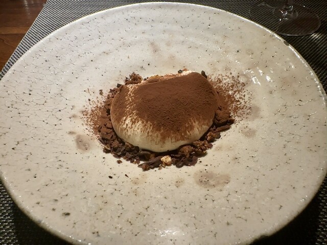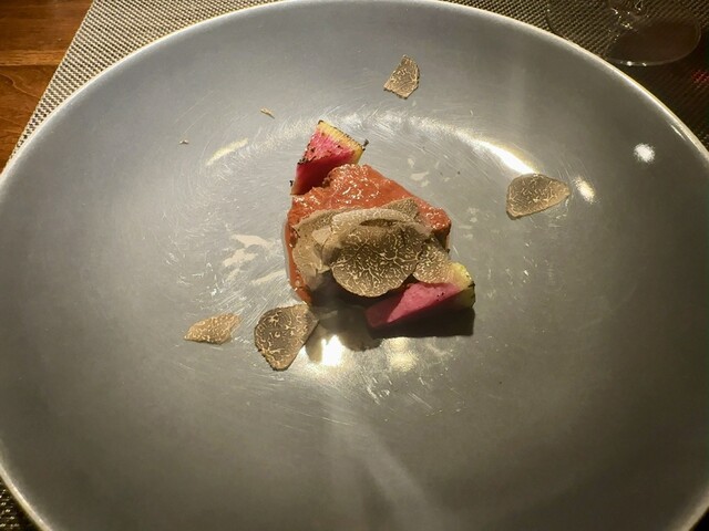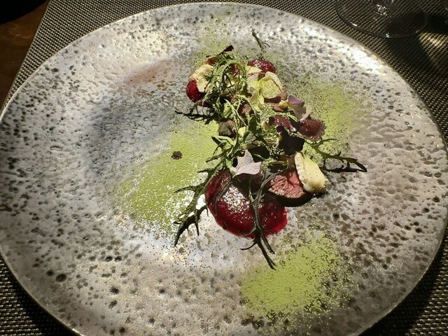 夜はペアリングの選択必須のコース1本、一斉スタート。昼少々飲んでいたので、ソフトドリンクペアリングで、別でグラスワインを少々頂きたいとお願いしたが、ペアリングでないとグラスでは出せないと…