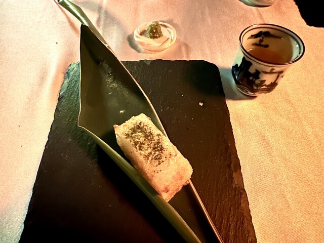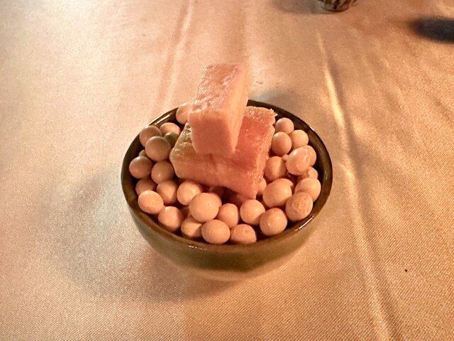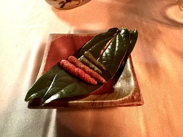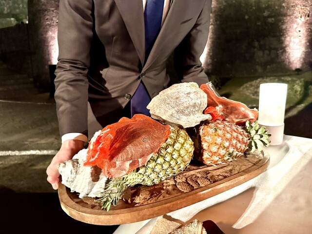 沖縄でディナー食べてるのに、結構寒い。とっても素敵な料理が出て来てるのに、ふとみあげるとライトアップされた城壁があって、見慣れない植物が生えている。やっぱり、なかなか体験できない。