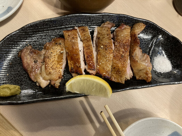 手羽先も面白く焼かれていて、先の部分は皮が薄くてカリカリした食感で、下の皮の部分はもちもちしていて、身は柔らかくジューシーです。骨周りの味がしっかりしています。