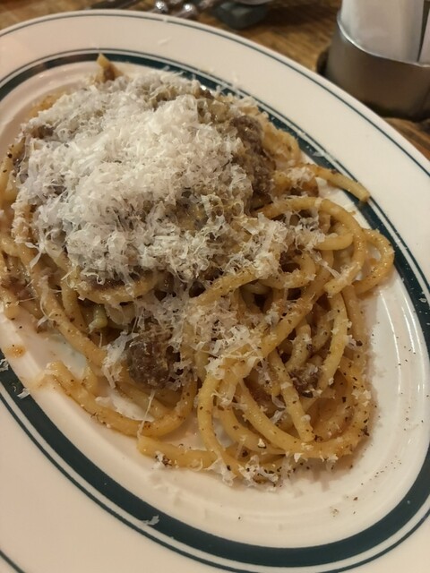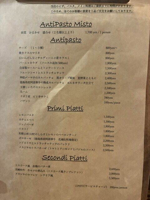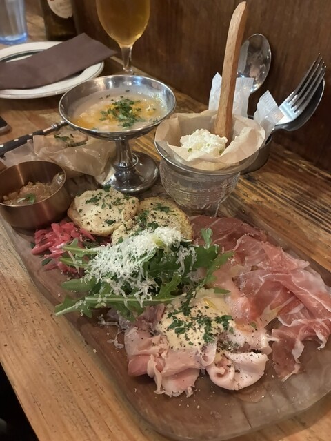 初めての訪問だったので、店員さんおすすめの「前菜盛り合わせ」「ボロネーゼ」「フンギビスマルク(キノコピザ)」「赤鶏のバター煮」を注文。