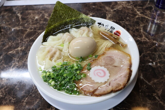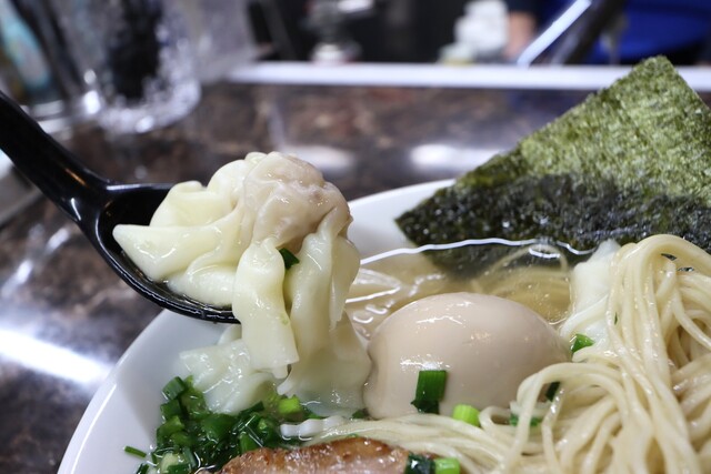 ネギ、メンマ、海苔、ナルト、味玉とワンタンの内容です。