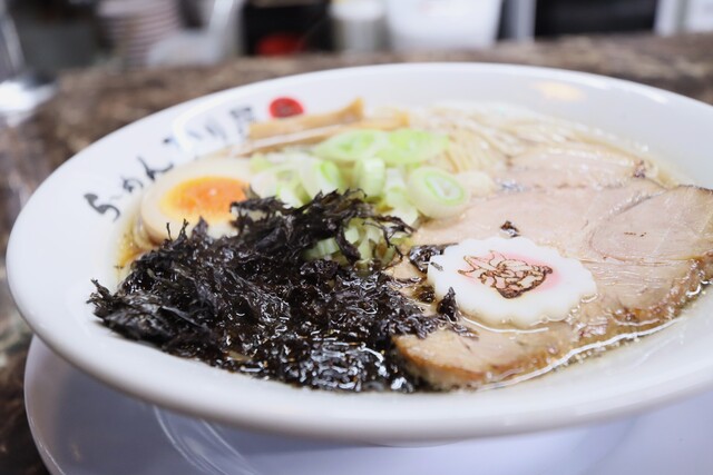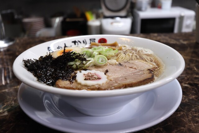 トンコツ、豚肉、昆布、アゴ煮干しの一杯です。
