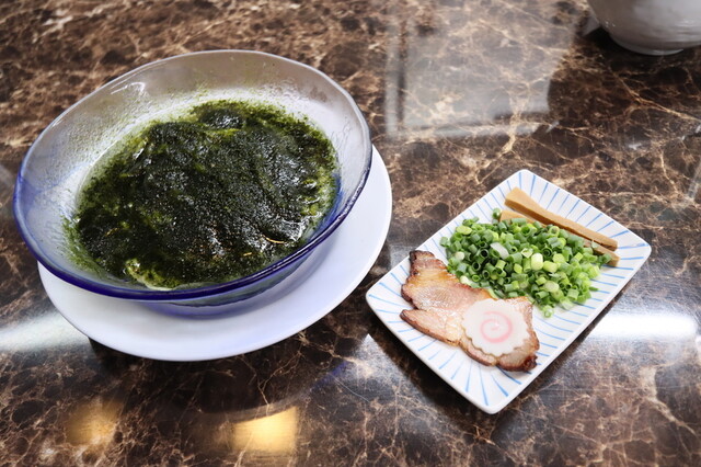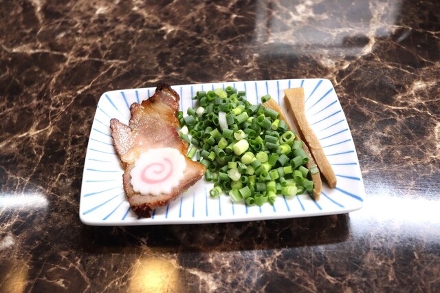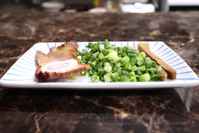 小口切りの青ネギとムラサキ玉ねぎ、メンマ、華アラレのラインナップです。
