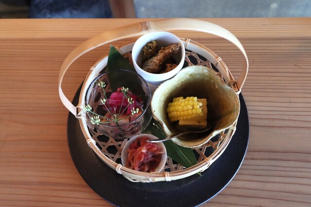 特注の素敵な竹カゴに小鉢が並んでいます。