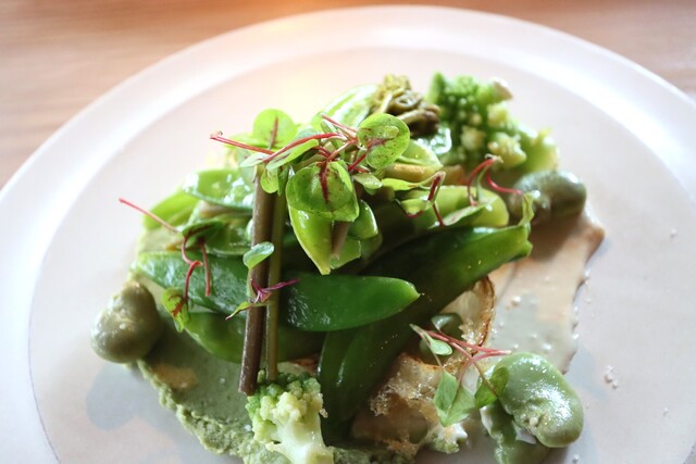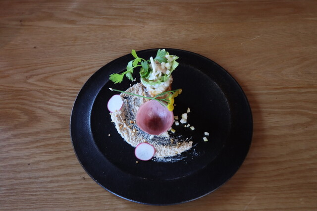 ローゼルのドレッシング、ヒヨコ豆のペースト状のソースで頂くひと品。