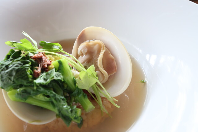 ホタテの貝柱と鶏から出汁を取り、