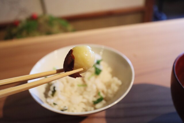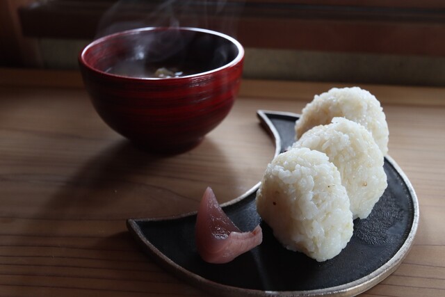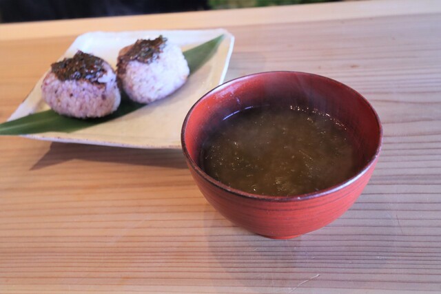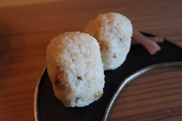 続いて新生姜のおむすびと、自家製味噌のけんちん汁。
