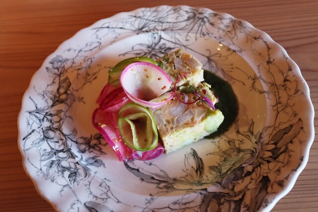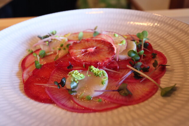 3色の大根にブラッドオレンジ、自家製の柿酢でカルパッチョ風になってます。