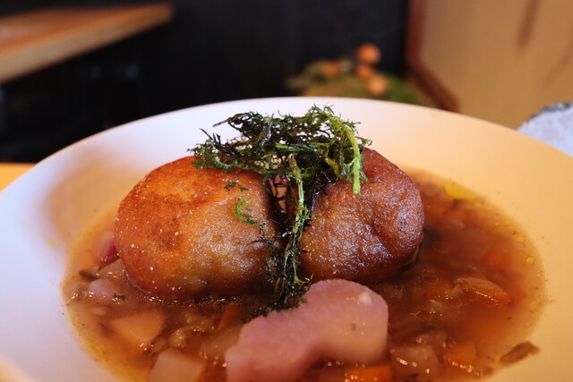 お団子の中は魚のすり身、竹輪みたいな感じかな。