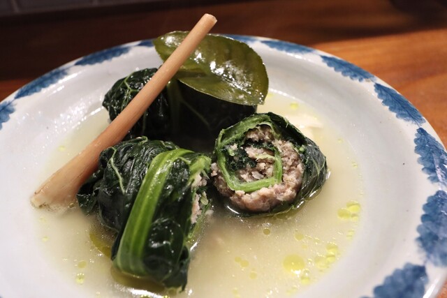 黒キャベツで巻かれた中身は青唐辛子を入れた肉団子。