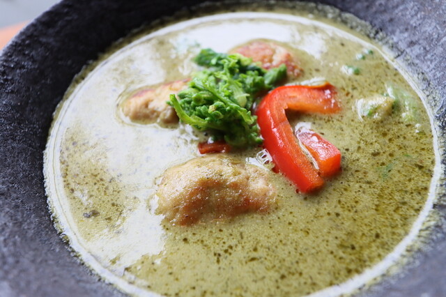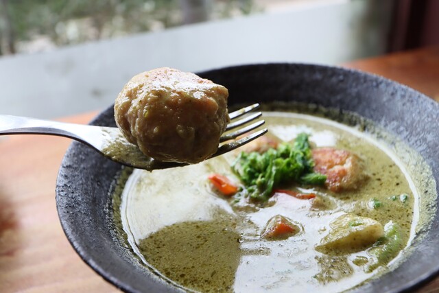 グリーンカレーには鶏団子、カブ、菜の花、パプリカなどが入り、