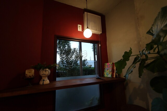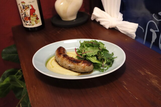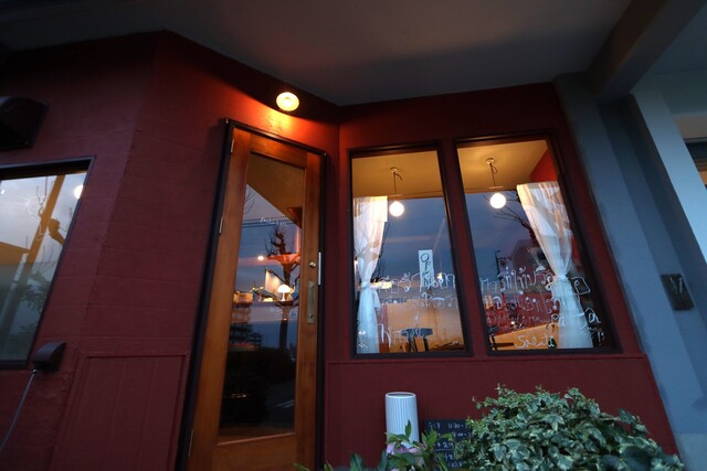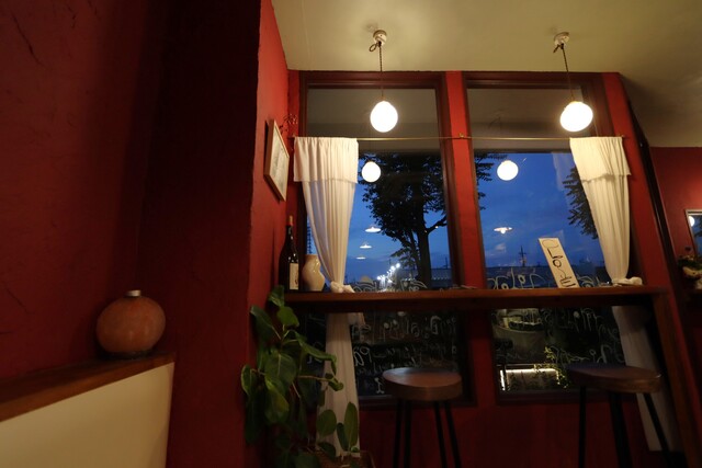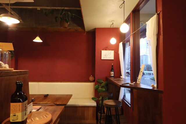 ワインカラーの店内はカウンターに5席とテーブルに10席ほど。