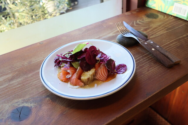 軽く焼いた鰆にビーツの色に染まった茄子などを、