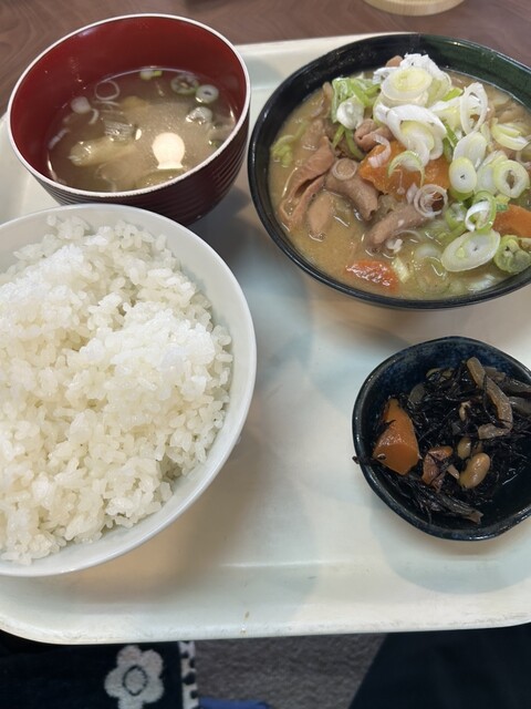 豚汁定食を頼みました。ご飯の盛りが大関サイズで嬉しかったです。小鉢はひじきと白菜漬け物〜美味しかったです〜ご馳走様