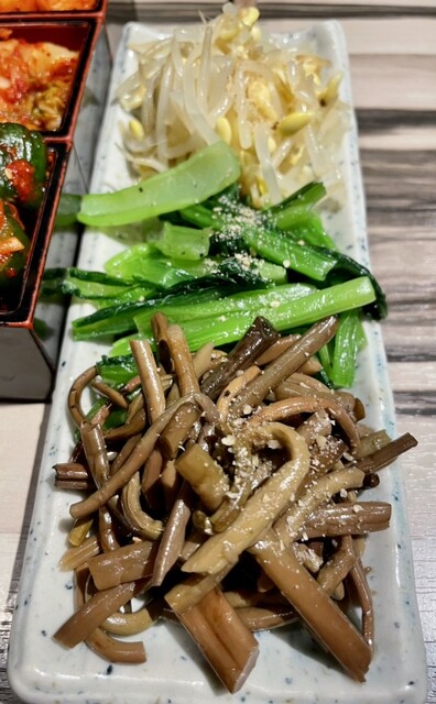 キムチの辛味が程よいシャキシャキ感とナムルのごま油の香りでビールが進みます。