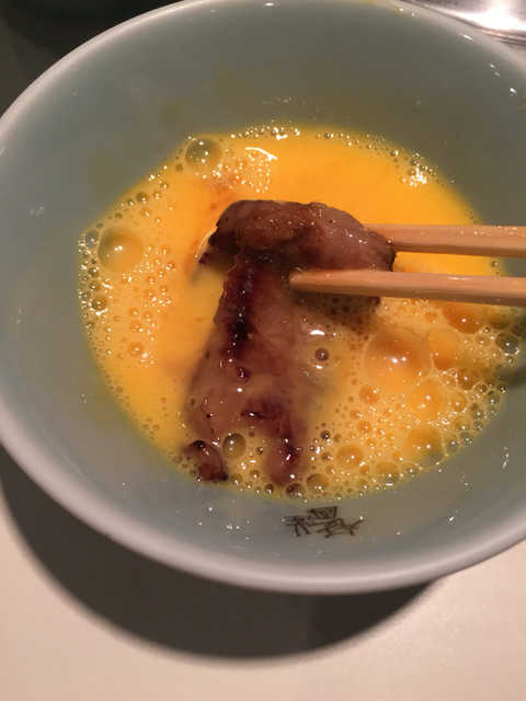 カルビを卵に付けて食べる
